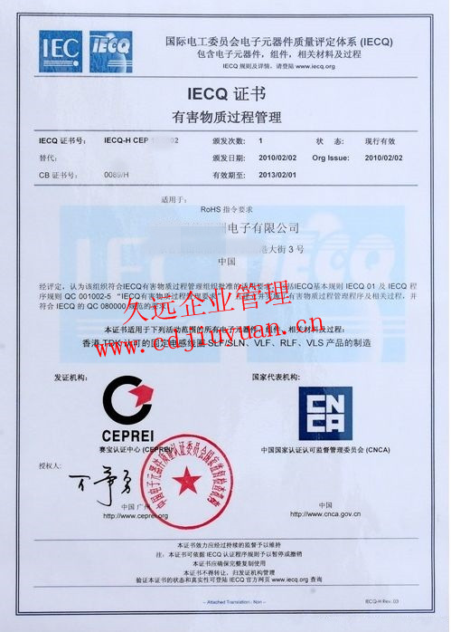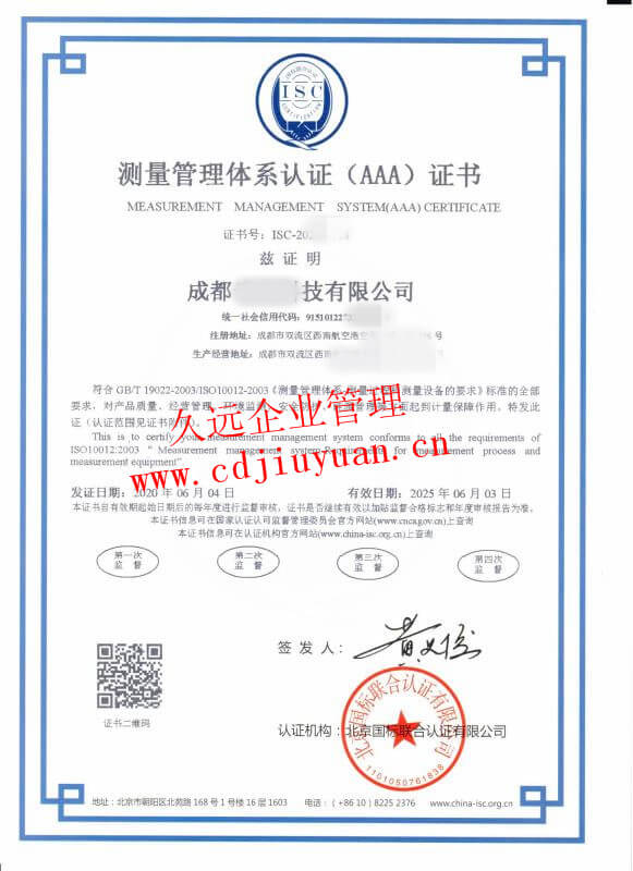 有害物質過程管理體系認證證書  測量管理體系認證證書