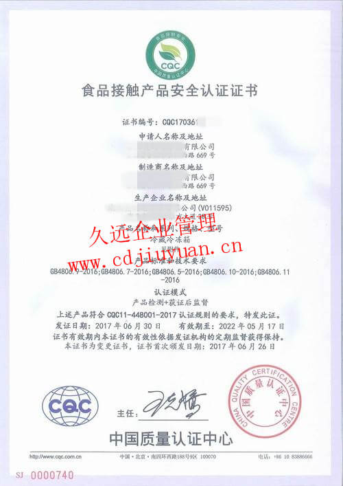 中國環境標志產品II型認證證書(十環II型)  食品接觸產品安全認證證書