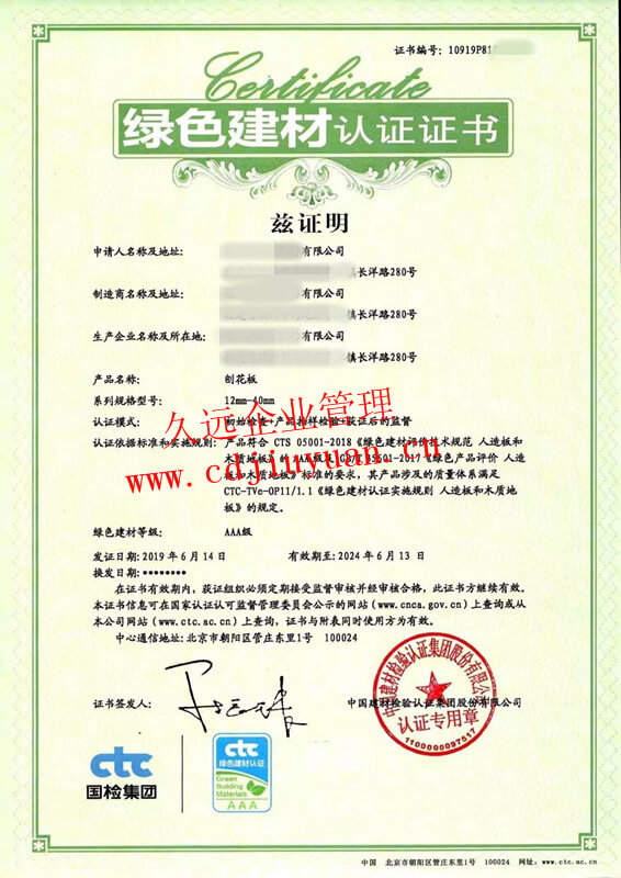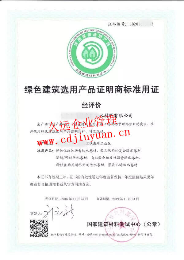 綠色建材認證證書  綠色建筑選用產品認證證書