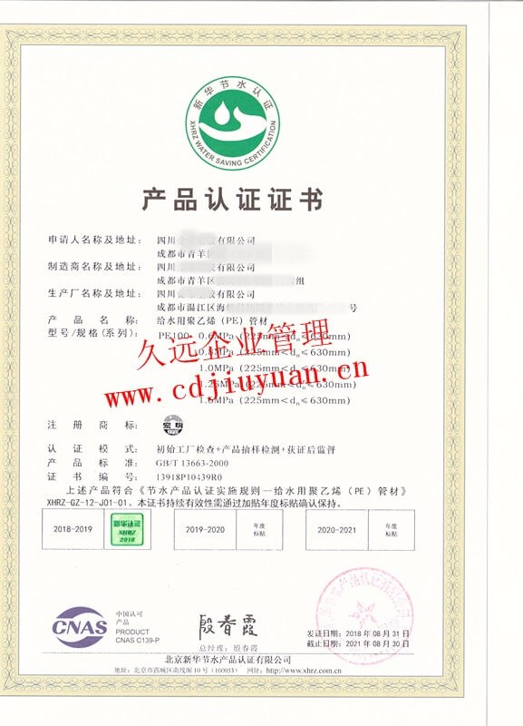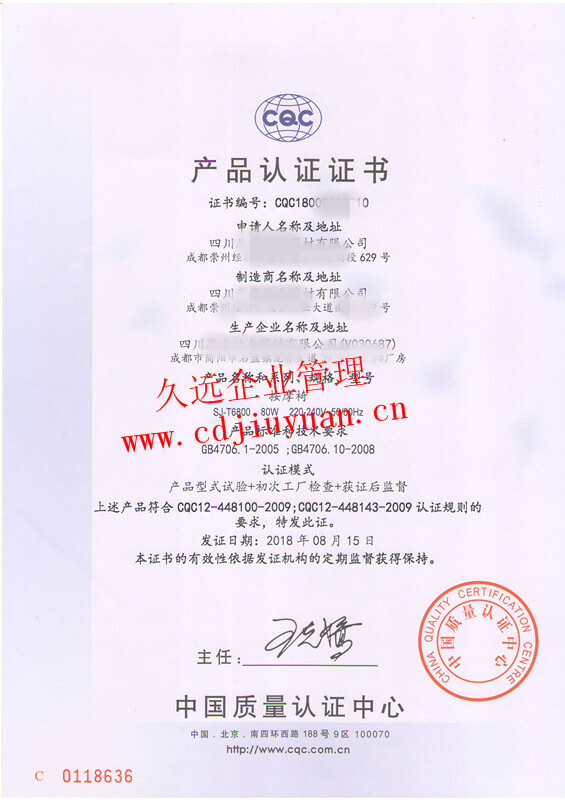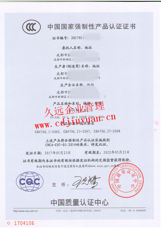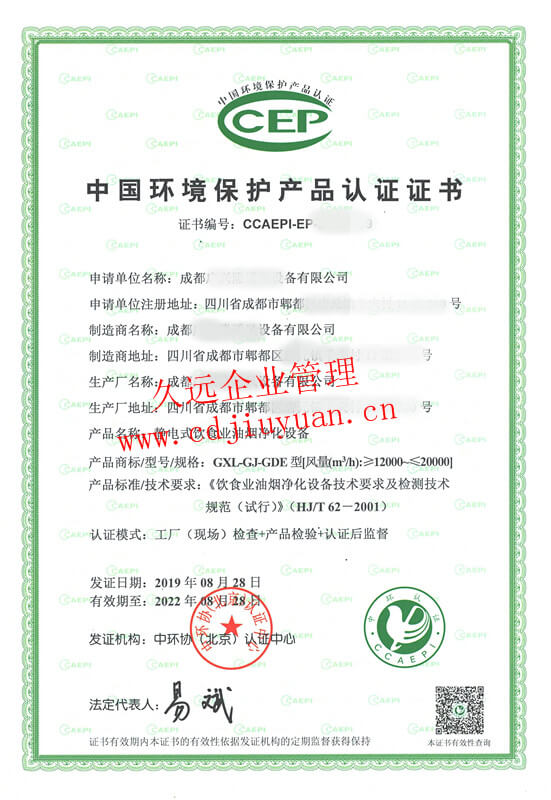 中國環境保護產品認證證書  CQC標志產品認證證書