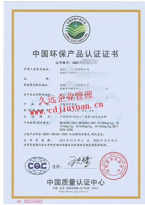 人類工效學產品認證證書  中國環境標志產品認證證書(十環認證)