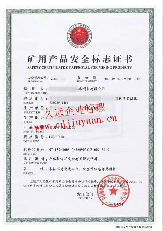 知識產權管理體系認證證書  礦用產品安全標志認證證書